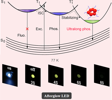图3. PUs在77K条件下的余辉机理图(上图)及具有余辉现象的LED器件效果图(下图)。