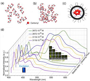 图2 PUs在稀溶液状态下(a)、浓溶液状态下(b)以及聚集状态下(c)的分子排布示意图; (d) 稳态/瞬态光谱和不同浓度羰基簇造成不同长短寿命图像。图片来源:Macromolecules