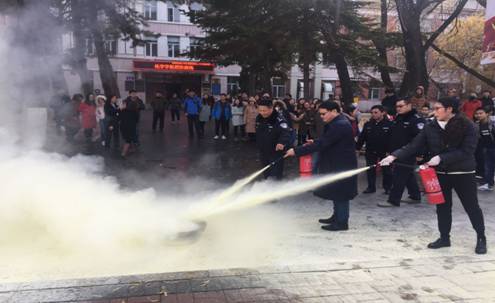 本次演练分两个部分内容:先是学院自行组织逸夫科学馆及化学楼的师生进行疏散模拟演练;随后师生们在保卫处工作人员的指导下进行了灭火实操演练。